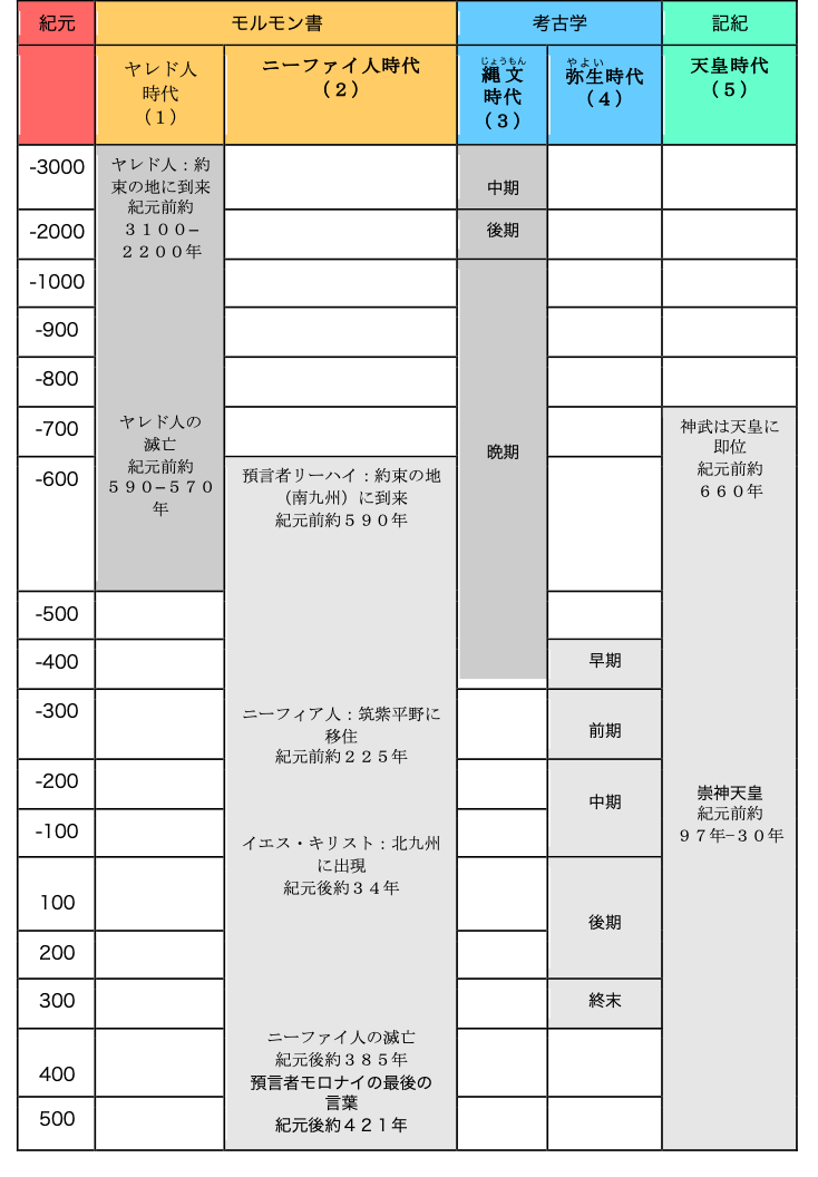 ヤレド人時代の年表はすでに前者によって推計されまていした2。ヤレド人はバイブルに見られるバベルの塔の出来事後に神の導きによって約束の地(日本)へ逃れました。 (参照:エテル書1:33、http://ja.wikipedia.org/wiki/バベルの塔)その出来事は中東で起こりました。(バイブルの学者たちはこの出来事の時期をすでに推計していました。) 上記の表一では紀元前3100年−2200年の時期はバベルの塔の出来事から推計されました。ヤレド人の文明は九州と本州に跨がる関門海峡から本州の名古屋に至るまで栄えました。