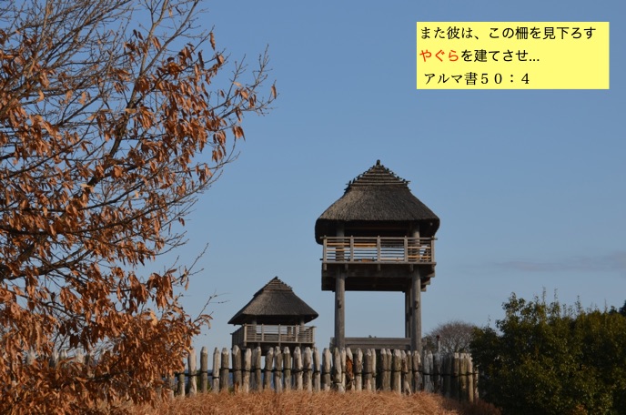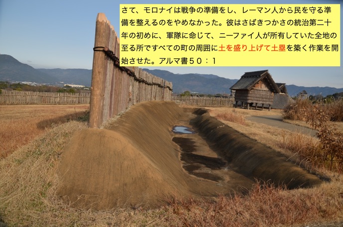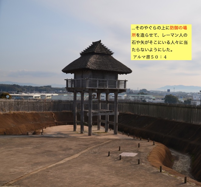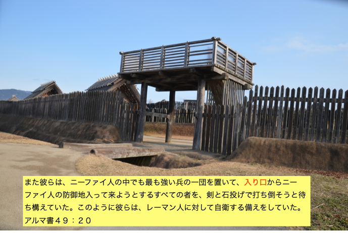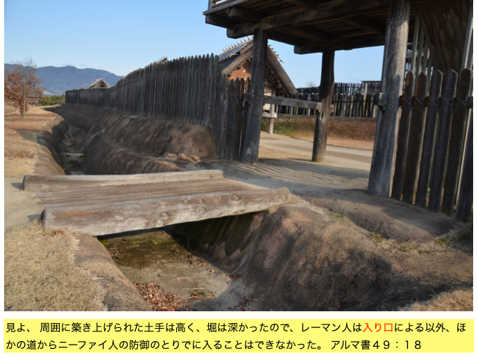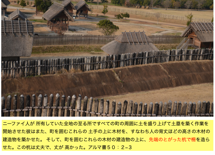 モルモンはニーファイ人の町の入り口を描写しました。この弥生時代に建設された吉野ヶ里遺跡の村はモルモンの説明を付け加えたものです。